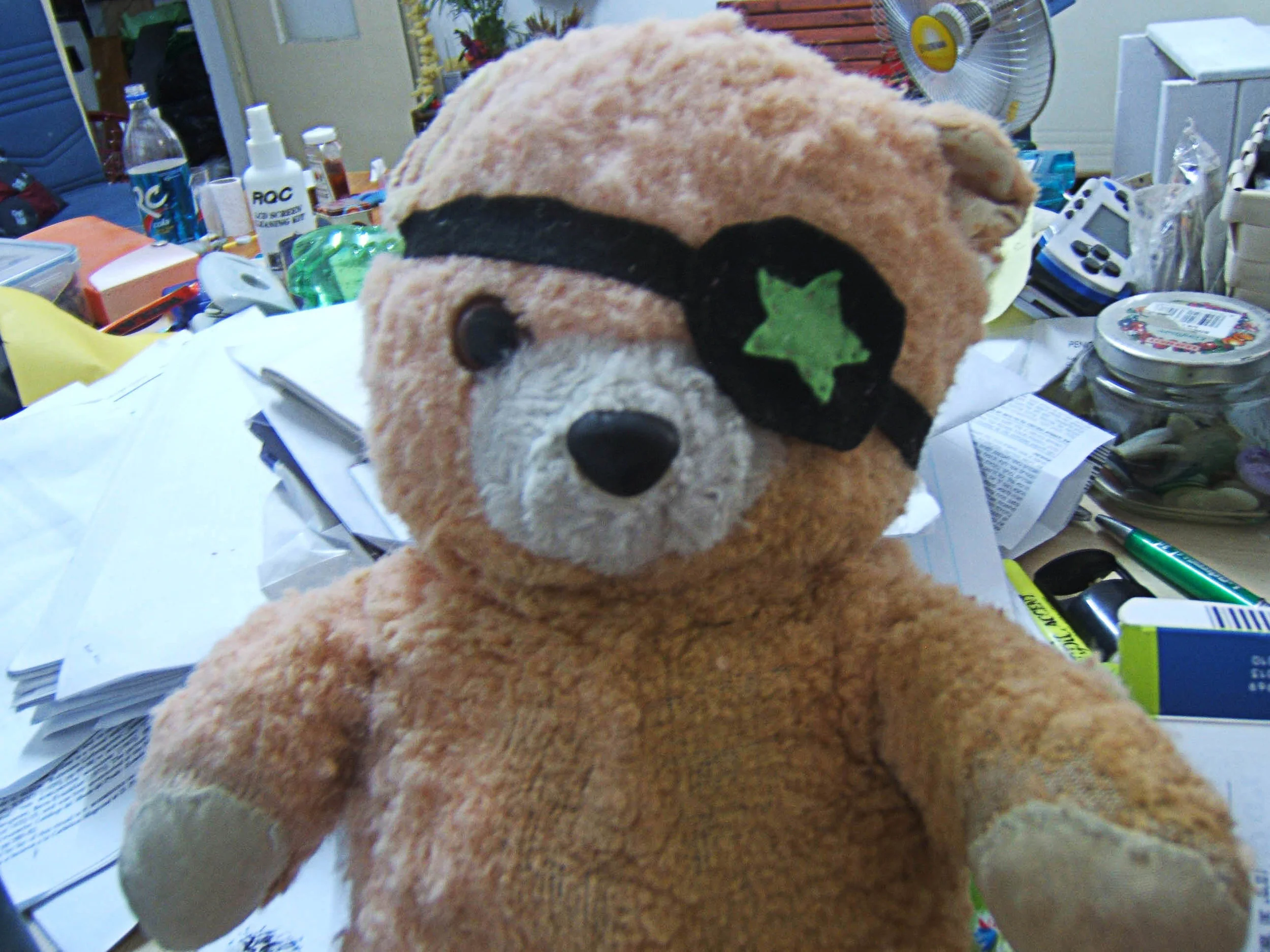 הדבר הבא שעשיתי היה לקנות עין חדשה בשבילו. הזמנתי ערכה של שני זוגות עיניים לדובים דרך איביי. בגלל שנאלצתי לחכות מספר שבועות עד שהעיניים יגיעו, ובגלל שלא רציתי שדובי יישאר עם עין חלבית ופגועה חשופה לאוויר, תפרתי לו רטייה בלבד. הוא הסתובב ככה עד שהחלפתי לו את העין באחת טובה